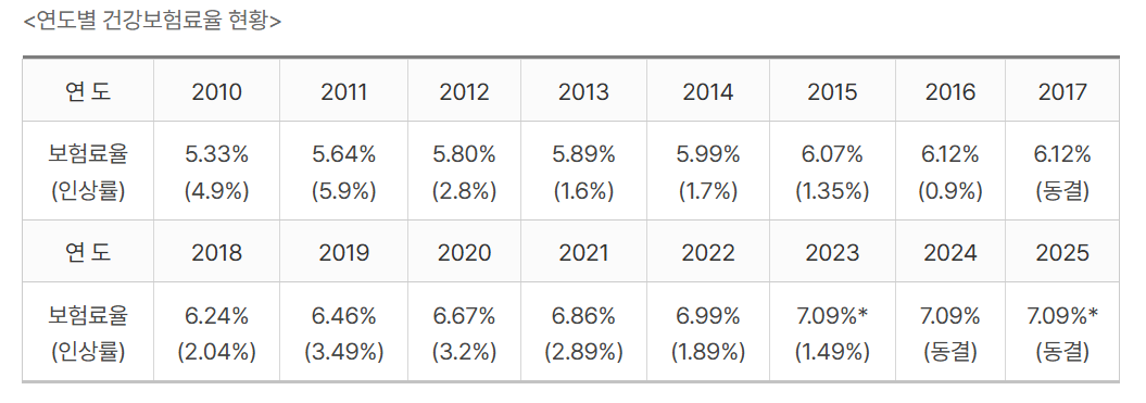 2025년에는 건강보험요율은 그대로 유지되었고, 장기요양보험요율만 인상되었습니다. 이는 정부가 고물가 상황에서 국민 부담을 줄이면서도 고령화에 대비한 재정 대응을 병행하려는 정책적 결정입니다.