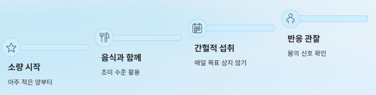 장기간 매일 반복 섭취하거나 양을 점점 늘리는 방식은 피하는 것이 바람직합니다. 섭취 후 속쓰림, 메스꺼움, 불편 증상이 나타난다면 즉시 중단하고, 몸의 반응에 맞춰 섭취 빈도와 양을 조절하는 것이 가장 안전한 방법입니다.