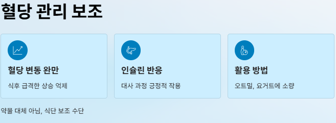 계피가루는 식후 혈당이 급격하게 오르는 상황에서 혈당 변동 폭을 완만하게 만드는 데 도움을 줄 수 있는 재료로 알려져 있습니다. 이는 계피가 인슐린 반응과 관련된 대사 과정에 긍정적으로 작용하는 성분을 포함하고 있기 때문입니다. 다만 계피가루는 어디까지나 식단 관리의 보조 수단이지 약물 대체 개념은 아닙니다.