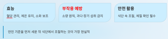 이러한 조건에 해당한다면 건강식품처럼 매일 섭취하는 방식보다는 음식 조미 수준의 소량 활용이 더 안전합니다.