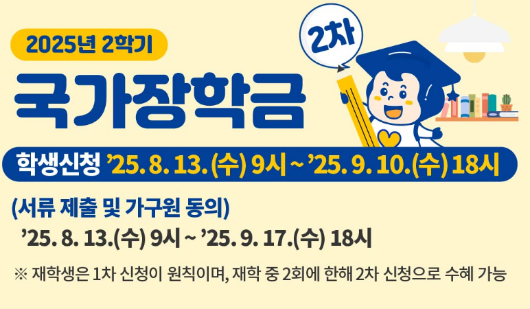 2025학년도 2학기 국가장학금 2차 신청은 9월 10일 18시까지 진행되며, 모든 대학생이 신청할 수 있습니다. 이번 학기부터는 지원 단가가 인상되고 주거안정장학금이 새롭게 도입되면서 실질적인 혜택이 강화되었습니다.