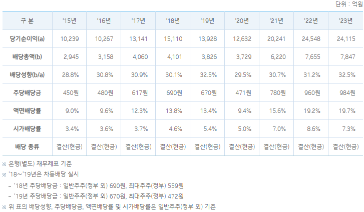 ● 2024년(예상): 주당 배당금 1,040원, 배당 수익률 7.3%, 배당 성향 34.5%