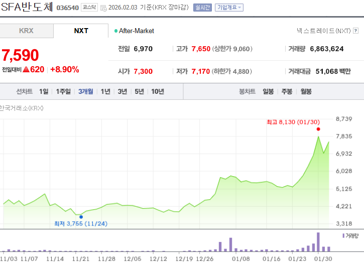 최신 기준 SFA반도체는 7,560원에 거래되며 전일 대비 590원(+8.46%) 상승했습니다. 장중 고가는 7,650원을 기록하며 매수세가 꾸준히 유입되는 흐름을 보여주었습니다.