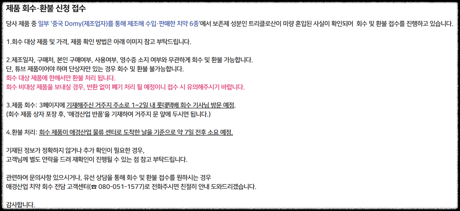 3. 애경 2080치약 회수 및 환불 신청 방법
