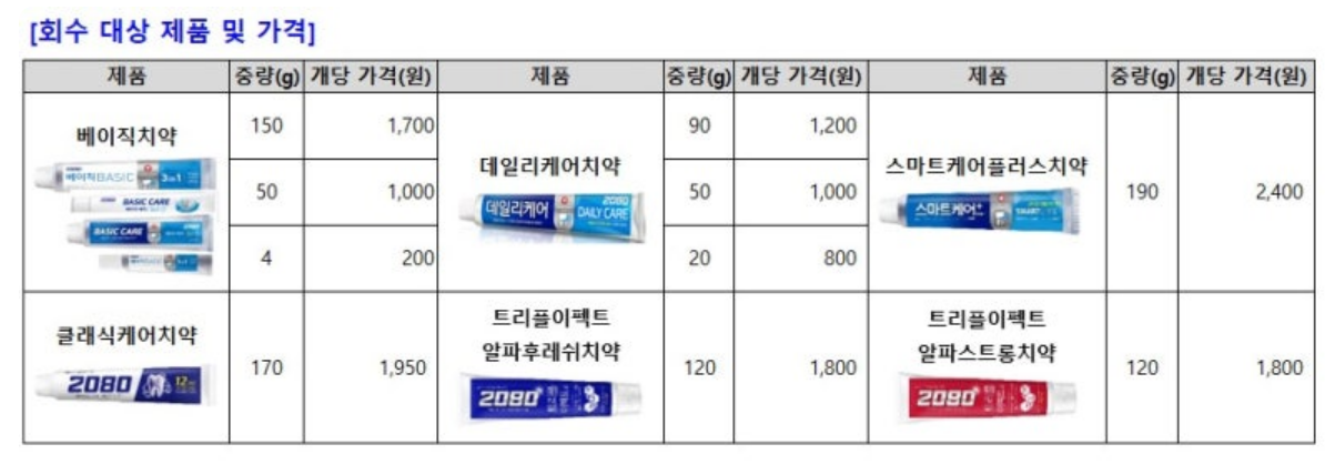 2. 회수 대상 애경 2080치약 6종 제품 리스트
