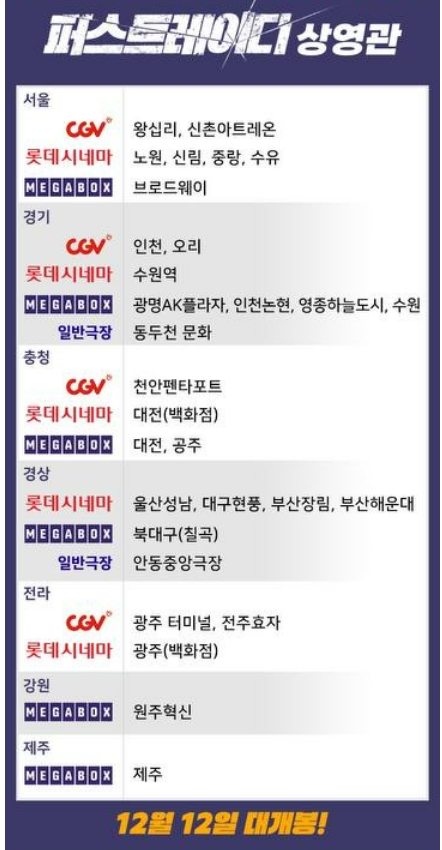 메가박스 신사 브로드웨이와 같은 인기 상영관에서는 이미 예매가 뜨겁게 진행되고 있으며, 광명AK플라자, 인천논현, 영종하늘도시, 수원, 대전, 공주, 북대구(칠곡), 원주혁신, 제주지역 메가박스 사이트에서 예매 현황을 실시간으로 확인하고 좌석을 예약할 수 있습니다.