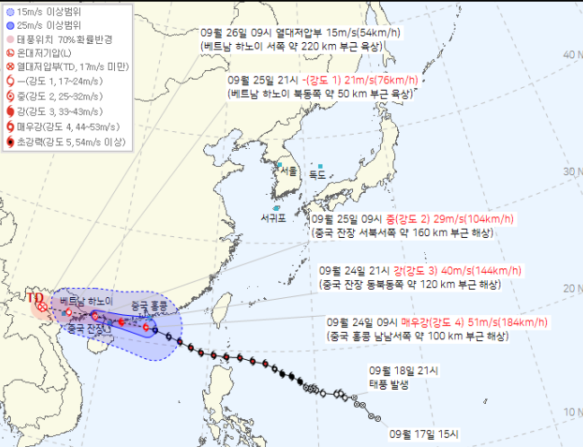 - 최대 풍속: 초속 약 51 m/s 내외(홍콩 부근에서는 시속 약 190~200 km급 강풍 보고)