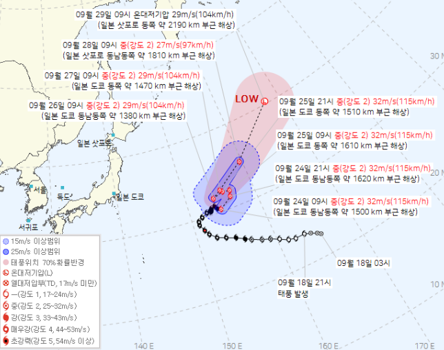 현재 예보로는 일본 동쪽 원해를 따라 점차 동북동진하며 한국 내륙에 직접 영향 가능성은 낮습니다. 다만 동해·남해 해역은 바람 강화와 파고 상승에 대비가 필요합니다.