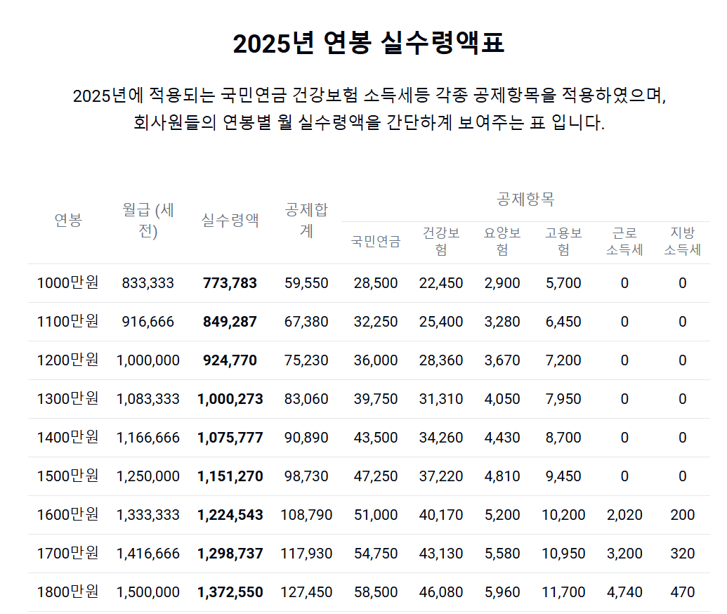 아래 표는 2025년 기준 연봉별 예상 실수령액을 정리한 것입니다. (부양가족 1인, 비과세 수당 없음 기준)