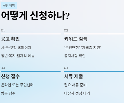 정리하면, 2026년 운전면허 지원금은 단순한 응시료 보조가 아니라 면허 취득 전 과정에 필요한 핵심 비용을 단계별로 줄여주는 실질적인 지원 제도라고 보시면 됩니다.